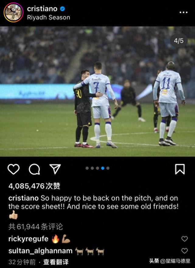 C罗还附文写道:“重回赛场太兴奋了,并且再次取得进球!能见到一些老友感觉很棒!”C罗的这条动态在短短的半小时内,便获得超过400万网友的点赞,这足见C罗和梅西超强的影响力。