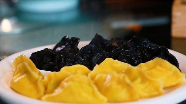 墨鱼水饺借用墨鱼胆囊里的墨鱼汁调面,色黝黑而筋道。馅料也格外有讲究,3斤以内的野生墨鱼,只选取墨鱼40%嫩白剔透成桶状的身体入馅,再加入韭菜调和,趁热一口吞,鲜美到头发丝儿!