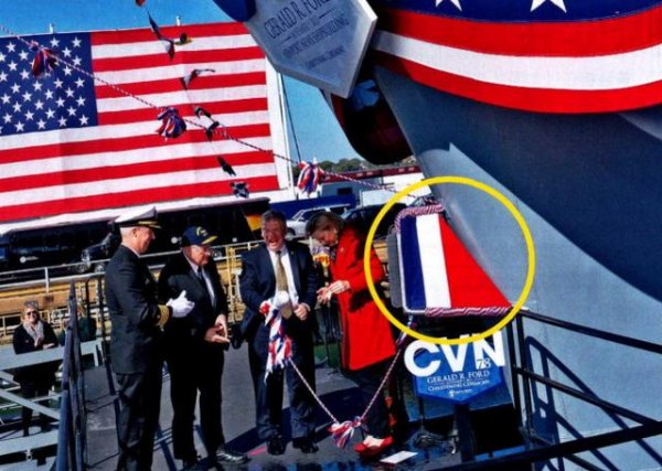 上图:2013年11月9日,美军福特号航母下水时,在舰舷下方专门焊了个U形铁架(黄圈内),前方有根刀刃般的钢条。这个钢条的作用只有一个:航母下水典礼时用于砸香槟,砸完就拆。砸瓶子的是美国前总统杰拉尔德·福特之女苏珊(右一)。