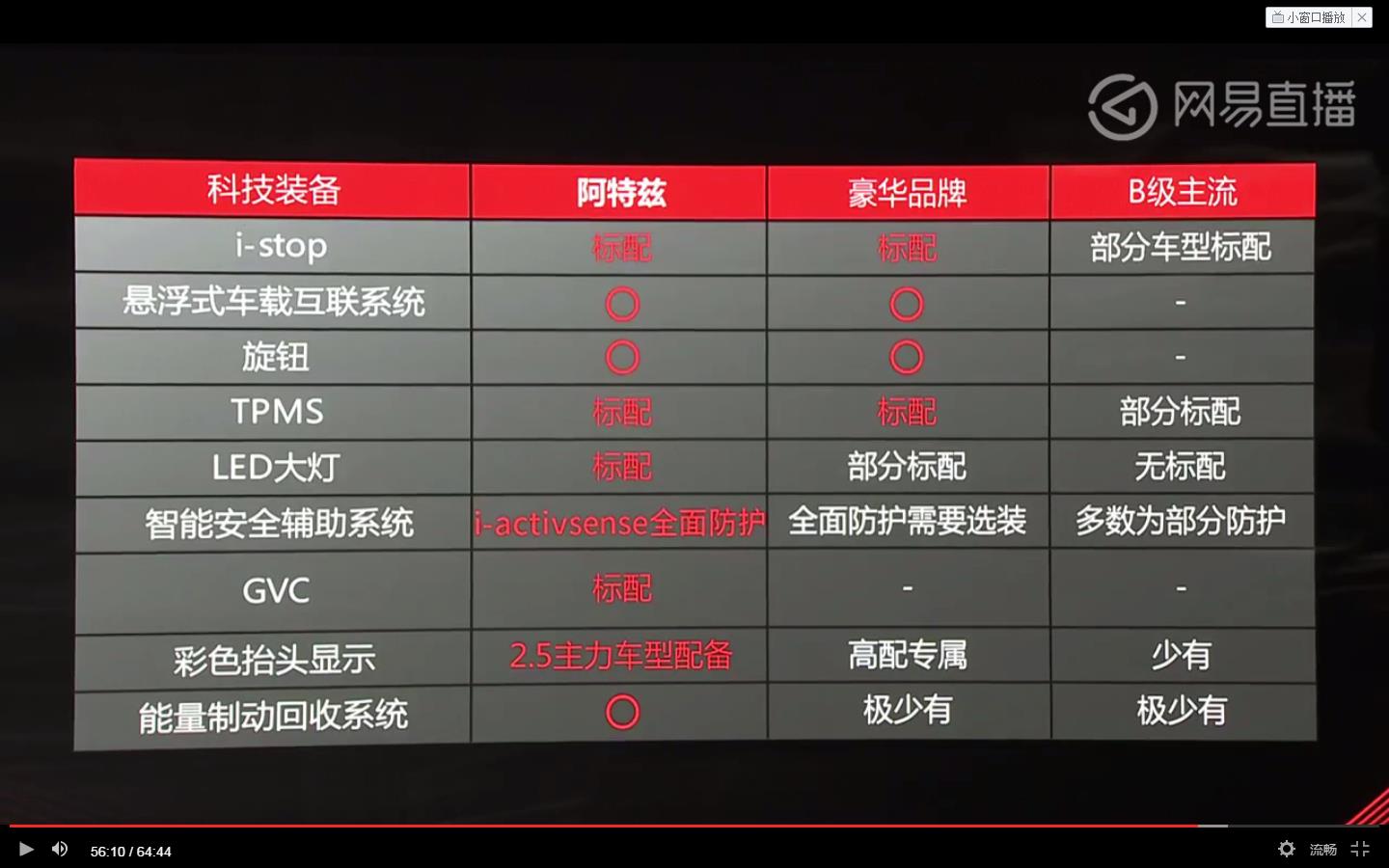 坚持操控,因为马自达一直在做驾驶乐趣、操控之类的,所以好多人说阿特兹是偏科生,只是操控好,其他的都完蛋,但别说,马自达就是在操控上一直在坚持,车身设计、底盘设计、还有各种乱七八糟的技术,都是在搞操控,这次新上的2018款阿特兹,GVC全系都加了,CX-4、CX-5、昂克赛拉也都加了,说白了还是在搞操控,没有哪个大众品牌还在这么坚持吧,以前连手刹也在一直坚持,但这次把手刹全变成电子的了,有点儿不那么能理解。另外,坚持小天窗,它是觉得小天窗就够用了,完全没必要迎合大众口味搞什么全景或大天窗,因为这么改,多多少少会影响操控性和安全性,不是不能改,而真是不愿意改,改也不难,也不是啥高科技。