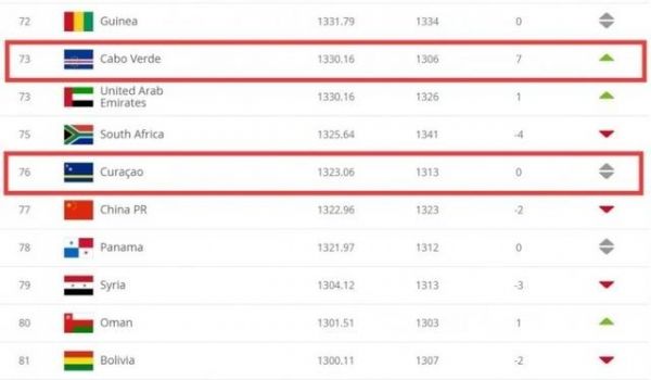 超越中国队的两个国家(地区)分别是非洲的佛得角以及来自中北美及加勒比地区的库拉索代表队。