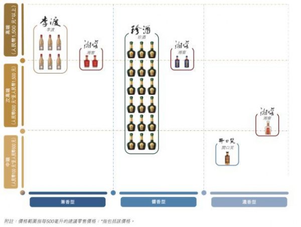 其中,开口笑主打100元-600元的中端价格带、珍酒覆盖次高端,李渡主打高端,湘窖则在次高端和高端均有布局。