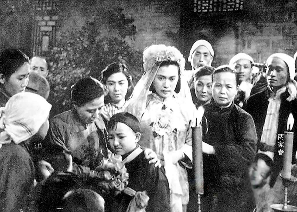 原来,1951年上映的《两家春》讲述了土地改革前,北方胶东农村赵家庄的小勇(王龙基饰演)与坠儿(秦怡饰演)两家互帮互助,亲似一家。坠儿爹为报恩,将女儿许给小勇做“童养媳”。土改后,小勇进入小学读书,坠儿当上学习模范。但在思想守旧的坠儿爹与小勇妈的催逼下,年方9岁的小勇与年满20岁的坠儿完婚。在学校,小勇的同学们总是嘲笑他娶了个“大媳妇”……