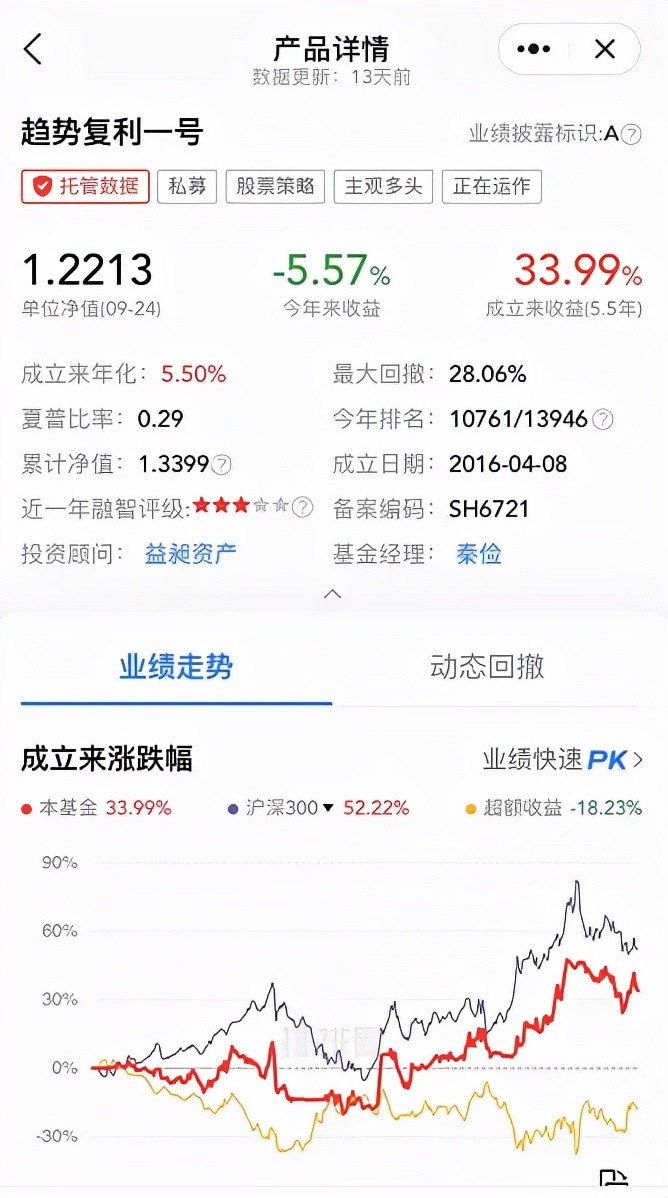 趋势复利一号成立于2016年4月,截至9月24日,该基金累计净值为1.3399,单位净值1.2213。成立5年多来的收益率为33.99%,这期间沪深300指数的涨幅为52.22%。这意味着,该基金甚至跑不赢指数。