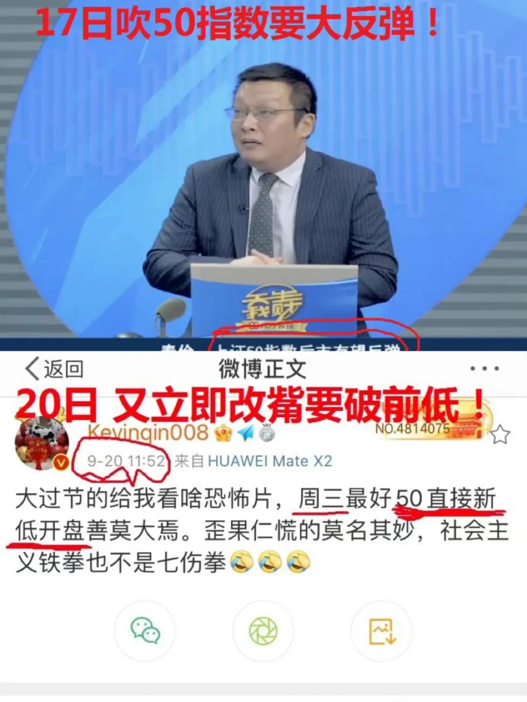 这位用户还贴出了两张对比图,一张是9月15日他上节目时表示“上证50指数后市有望反弹”,但在20日又说“上证50直接新低开盘”。
