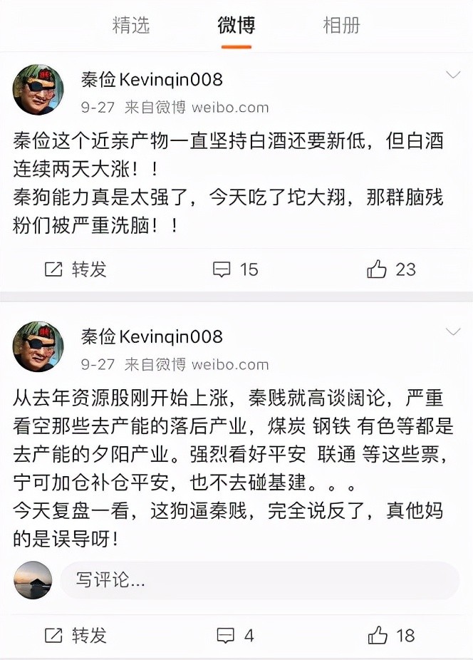 他举例了不少Kevinqin008关于市场判断的反向指标。就拿最近的来说,比如9月底,Kevinqin008坚持白酒要新低,但实际上白酒连续两天大涨。再比如,去年开始Kevinqin008就看空煤炭、钢铁、有色等行业,强烈看多平安、联通等股票 ,完全说反了……