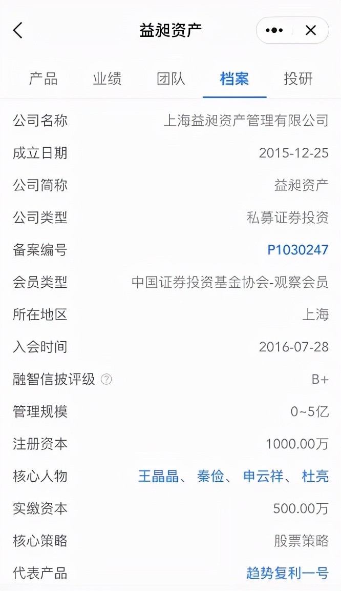 益昶资产的注册资本是1000万,实缴资本500万,目前管理规模为0-5亿,秦俭为公司核心人物之一,为公司副总经理。益昶资产在私募排排网目前仍有业绩展示的是:代表产品趋势复利一号和益昶价值精选一号。而趋势复利一号正是由秦俭管理的。