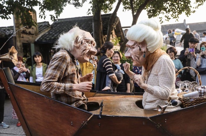 古镇嘉年华作为乌镇戏剧节一道独特的人文风景线,十天里,上百组表演团体,两千余场古镇嘉年华表演,包括即兴喜剧、戏曲、装置艺术、多媒体、传统舞剧、偶剧、数字化表演、杂耍魔术、肢体剧、实验诗乐舞短剧等表演形式轮番上演,丰满了乌镇西栅的三十多处户外表演空间,在石桥、码头、巷陌、广场、坊市、摇橹船,甚至水面、天空之间,搭建起观众与艺术的桥梁。开放包容的表演方式,多元融合的艺术理念,还有来自全国各地的藏戏、昆曲、傩戏、木偶戏、川剧、赣剧、独竹漂等非遗节目强势登场。十年来,海内外数以千万计的观众慕名而来,感受古镇嘉年华的沉浸氛围。本届乌镇戏剧节欢迎更加丰富多元的艺术表演,百花齐放,繁荣剧场之外的每个舞台。