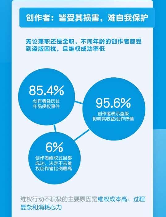 热播剧《锦心似玉》原著作者吱吱说,网络文学作家需要集中精力进行创作,让作家自己做盗版追溯、举证非常困难。调查显示,在遭遇过侵权的创作者中,仅32.1%的创作者有过维权行动。维权行动不积极的主要原因是维权成本高、过程复杂和消耗心力。