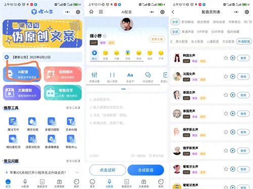 语言支持:牛片配音支持9种语言,包括普通话、粤语、四川话等多种方言以及英语和日语,满足不同语言需求的用户。价格合理:牛片配音的价格相比其他软件较为合理,提供了月费和终身两种付费方式,用户可以根据自己的需求选择合适的套餐。网页版体验:牛片配音的电脑网页版用户体验较好,适合习惯在电脑上进行视频剪辑的用户。声音优化:虽然牛片配音的声音种类多样,但样音的机械音较重,有待进一步优化以提供更自然的声音效果。媒小三微信小程序便捷性:通过媒小三微信小程序进行配音是一种非常便捷的方式,用户无需下载安装任何软件即可快速开始配音工作。操作简单:微信小程序通常设计简洁,用户通过简单的操作即可实现文字转语音的配音功能。免费体验:部分微信小程序提供免费体验的机会,用户可以在不支付费用的情况下尝试基本的配音服务。