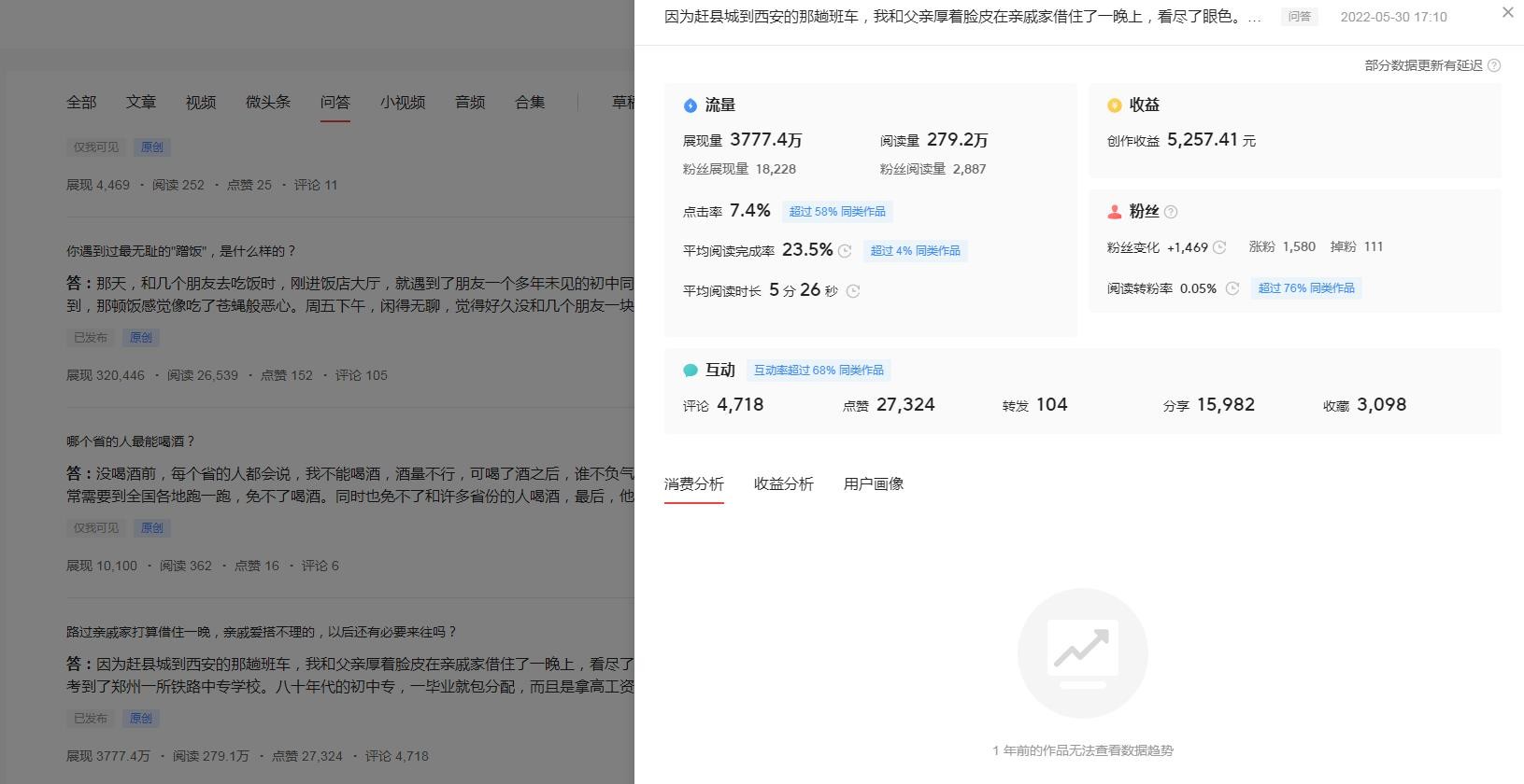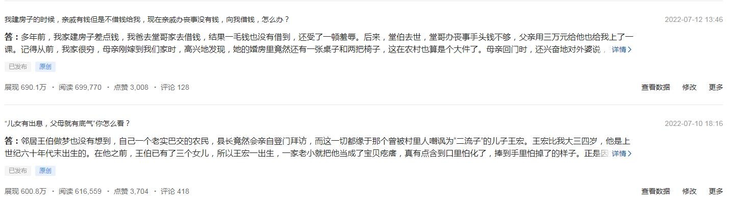 其中一篇问答《路过亲戚家打算借住一晚,亲戚爱搭不理的,以后还有必要来往吗?》将近280万的阅读量,5000多元的收益。当然也有许多几百个阅读量的问答。