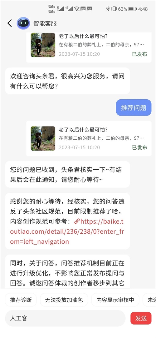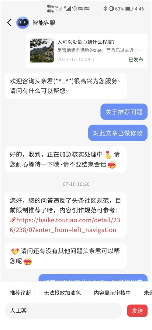 至于哪儿违规了,人工客服只是发了个头条社区规则的链接,根本看不出来哪是什么原因违规了。