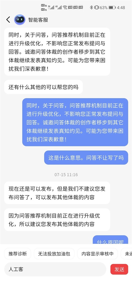 询问客服,让我问人工客服,连续三次输入人工客服后,人工客服出现了,但给我的答案是我的问答违规了。