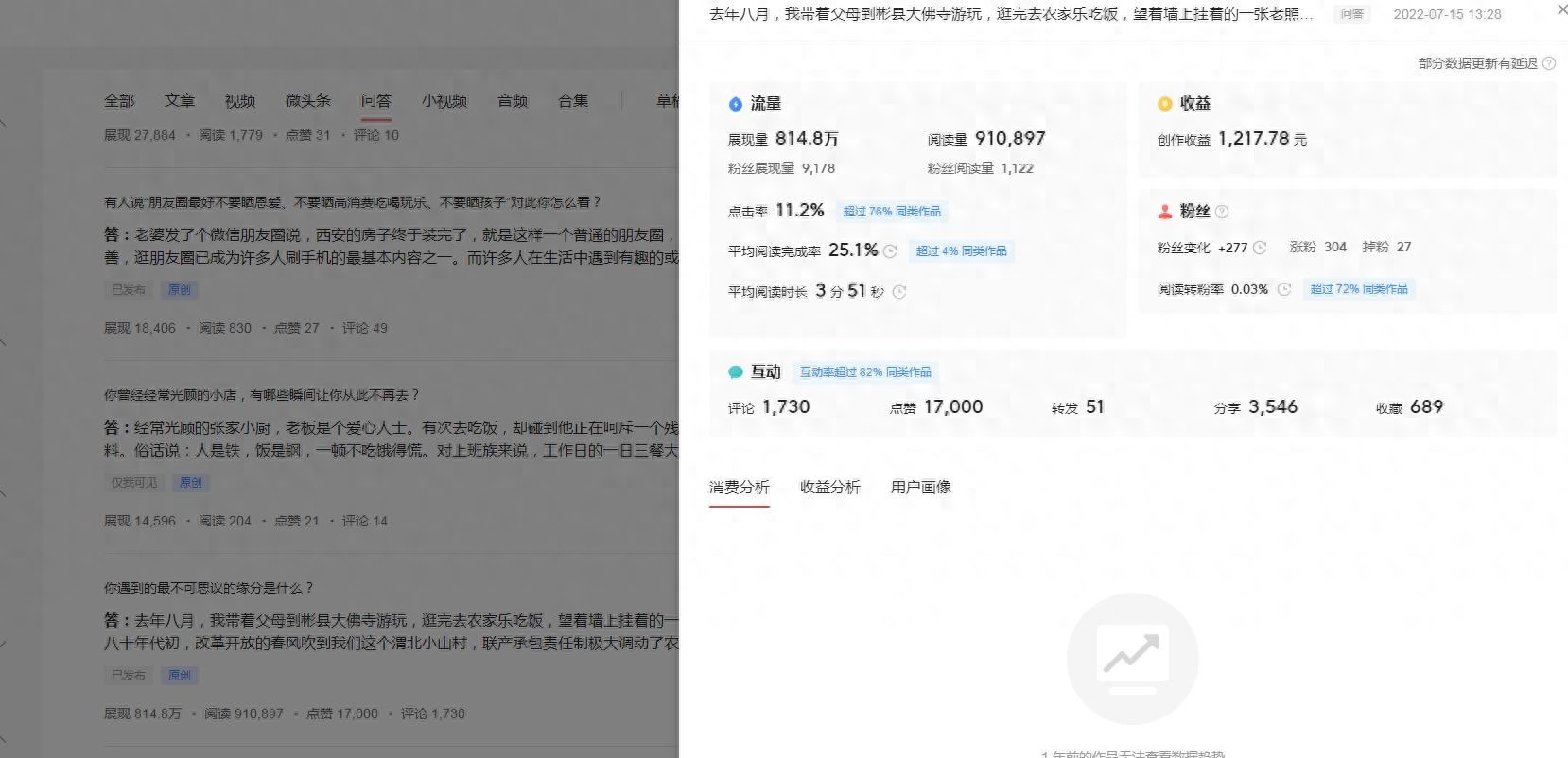 去年头条新规则出台后,问答就没有那么吃香了,甚至一段时间比微头条的千次阅读收益还低。但慢慢又涨了上来。