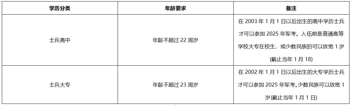注:士兵提干和优秀保送士兵,符合“在驻西藏和三类以上艰,年龄可以苦边远地区少数民族聚居区部队的少数民族士兵”放宽1岁(截止当年1月1日)。