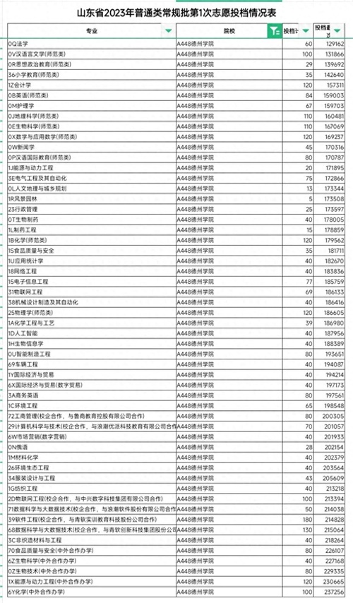 德州学院,位于中国山东省德州市,是一所具有悠久历史的综合性公办本科院校。在招生政策方面,德州学院2023年面向全国22个省、市、自治区进行招生,总录取人数达到5200人。在录取标准上,学校坚持公平、公正、公开的原则,以高考成绩为基础,综合评价学生的综合素质,确保优秀学子能够脱颖而出。此外,学校的录取流程设计合理,操作规范,既保障了考生的权益,又体现了学校的严谨态度。下面是德州学院2023年在山东省第一次投档录取情况: