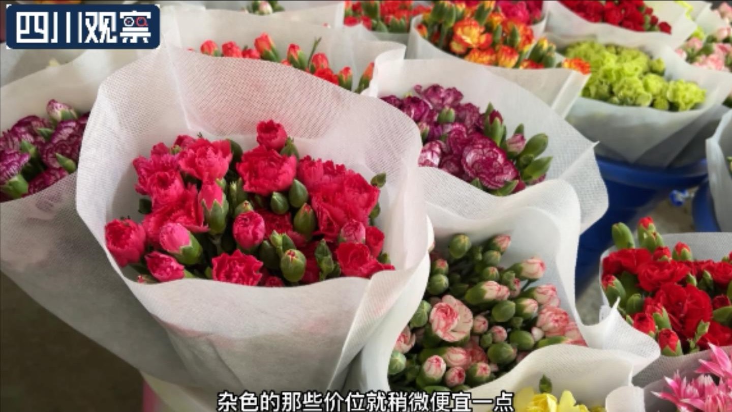 记者走进成都湿地花卉产业园核实,康乃馨分单头和多头两个品种,三八国际妇女节前,销量最好的为单头红色和粉色康乃馨,一束20支的批发价为60元到75元不等,而2020年同规格的康乃馨不超过30元一束,批发价上涨一倍,预估今年零售市场,包装较为精美的康乃馨花束价格在180元左右。
