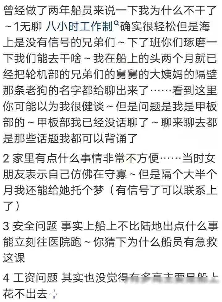 船员工资高的背后,隐藏着这样的困境,让不少人望而却步。船上的生活是孤独而艰苦的,更不用说还要应对复杂的人际关系。这些问题成了不少人考虑的绊脚石,让他们对船员这个职业望而却步。