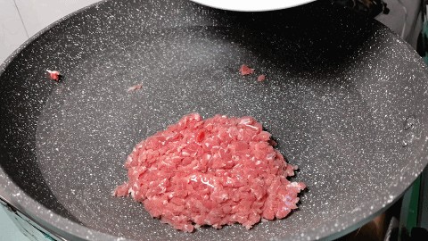 3.锅内加清水,凉水下入肉末和香菇丁,大火煮开后焯水1分钟,这样能去除杂质,焯水完成后控水捞出,并用温水冲洗一遍。
