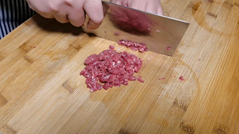 1.牛肉一块,先切成较细的长条,再切成细小的肉丁,这个过程比较费时,不能用绞肉机,需要慢慢切。
