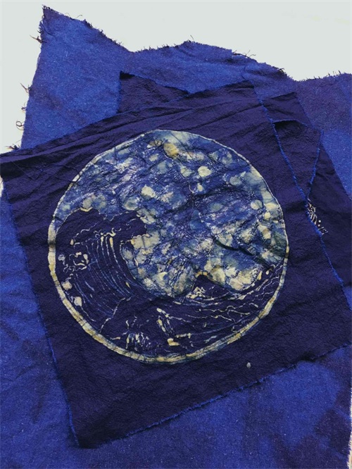 5.待蜡凝固,放到染缸中浸染,浸泡时间越长,染色越深(一般一件浸染两次)