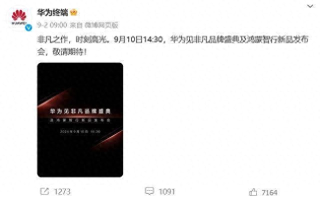 9月2日,华为终端称,“9月10日14:30,华为见非凡品牌盛典及鸿蒙智行新品将举行发布会,敬请期待!”