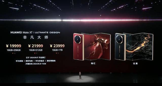 价格方面,华为Mate XT非凡大师提供三种配置,16+256GB 19999元、16+512GB 21999元、16GB+1TB 23999元,将于9月20日正式开售。