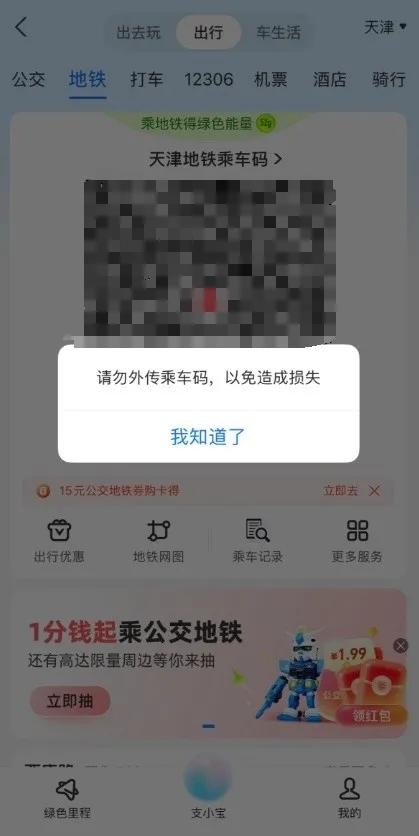 天津地铁乘车码正式接入支付宝