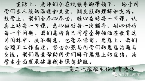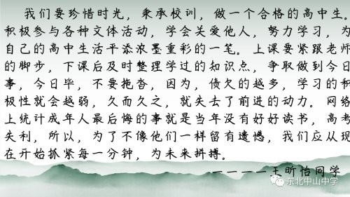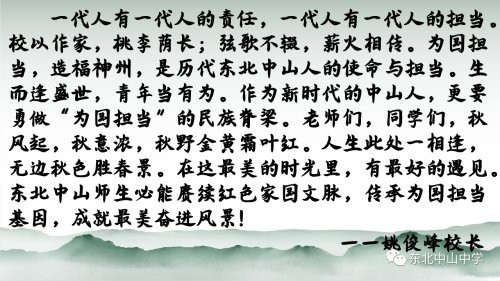 东北中山,校以作家,桃李荫长;一代一代的新老中山人,无不沐浴着家一般温暖的阳光。姚校长讲话以宽广的视角、缜密的理性,和作为师长的浓浓情怀,对全体同学提出了殷切的教诲和真诚的期望,语重心长,催人奋进。