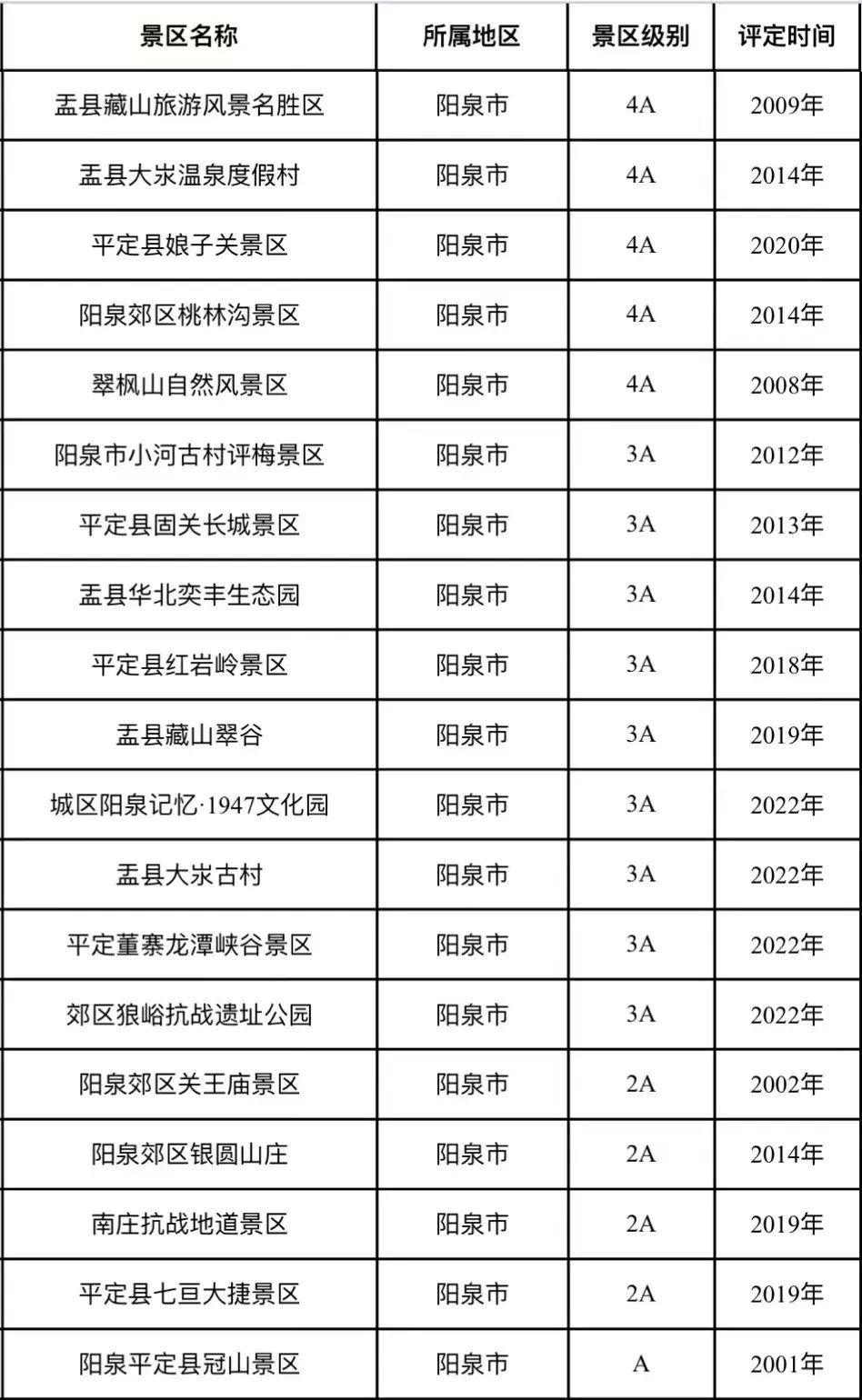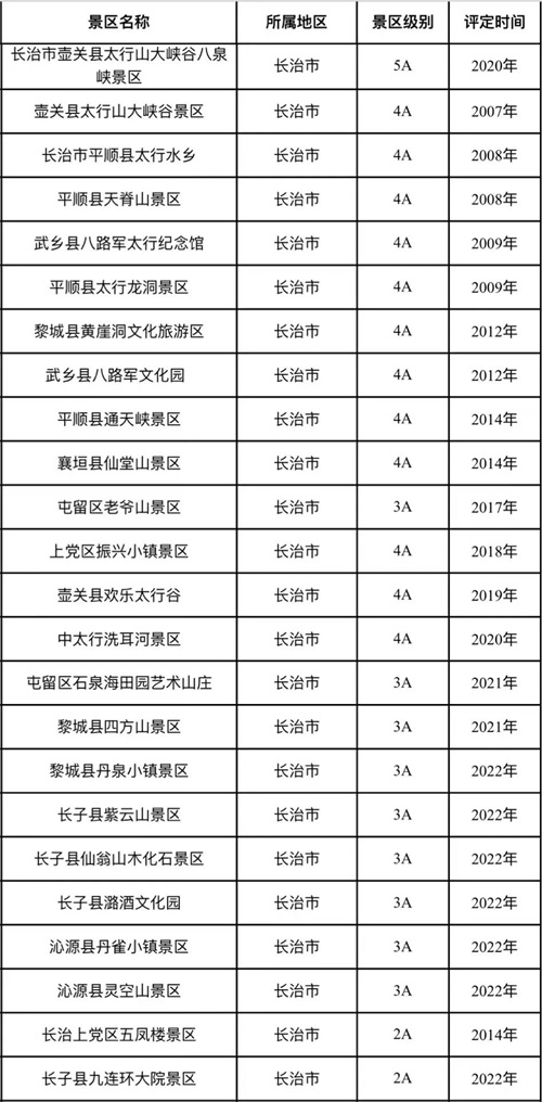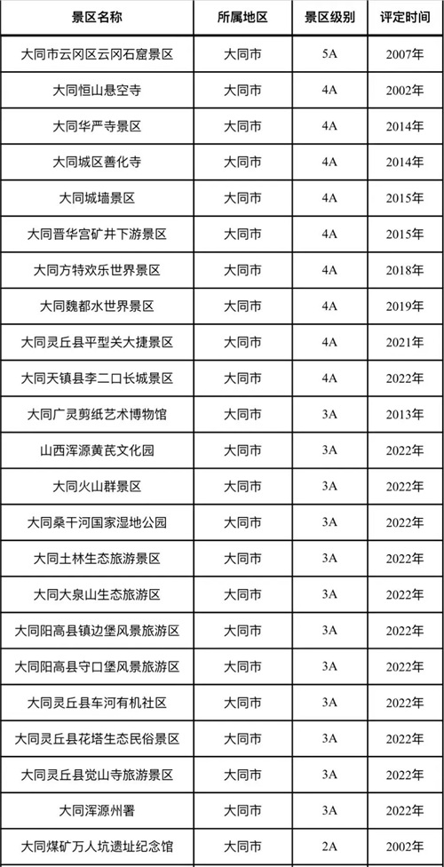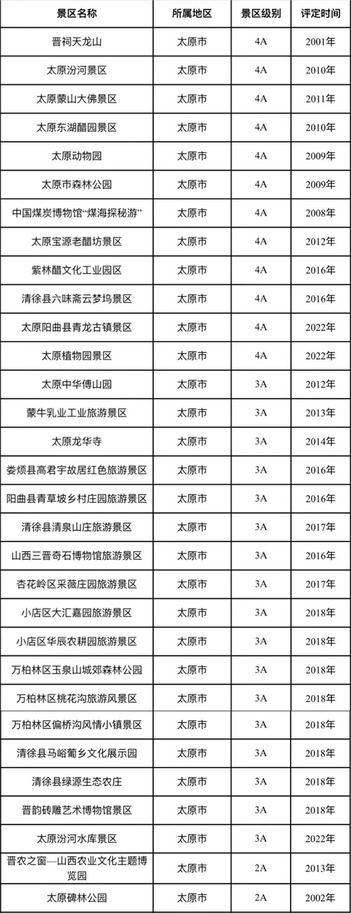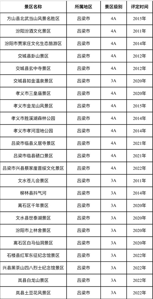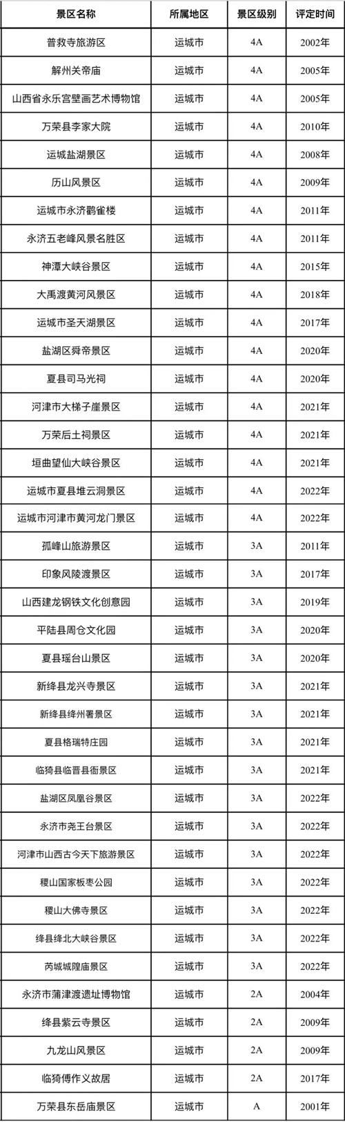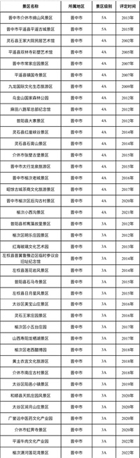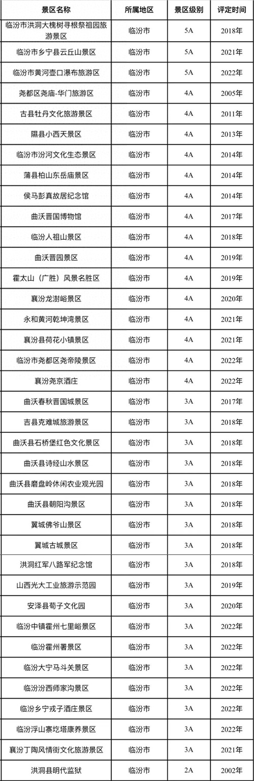2023年2月2日,山西省文化和旅游厅公布最新《山西省A级景区名录》,截至目前,全省A级景区共312个。临汾市A级景区37个,其中5A级景区3个,全省排名第一;4A级景区15个,全省排名第三。