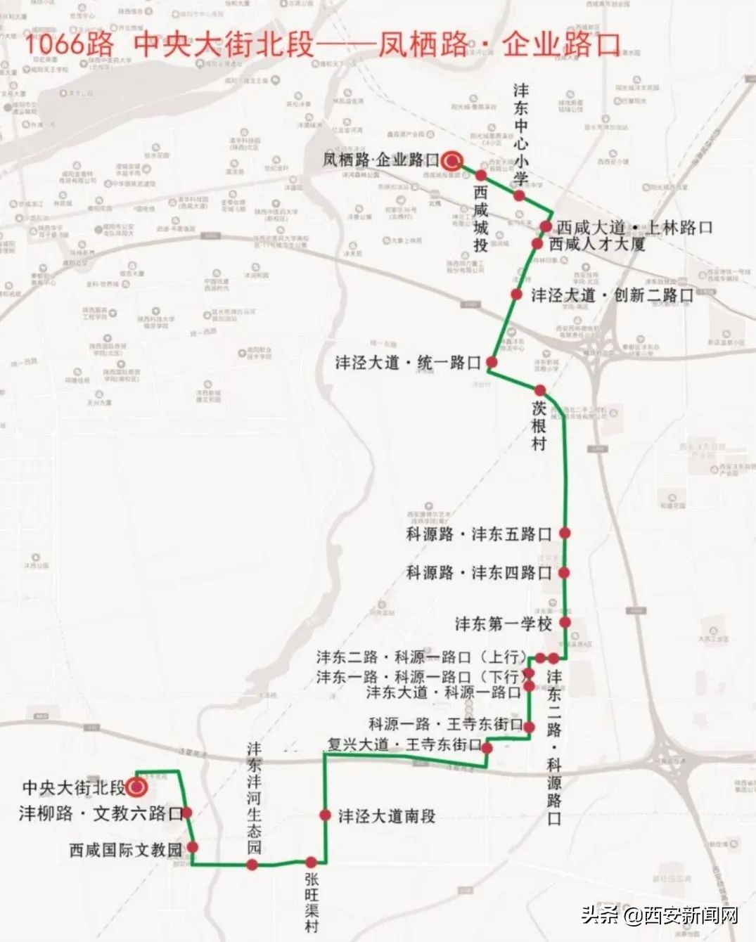 1066路由中央大街北段出发,经中央大街、镐京大道、沣泾大道、沣明路、复兴大道、王寺东街、科源一路、沣东二路、科源路、上林路至凤栖路·企业路口。全长约18km,运行时间为06:30—20:30,设置停靠站点22个。
