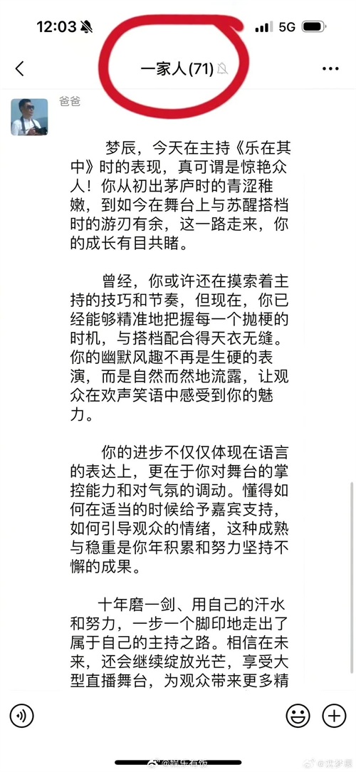 沈梦辰最近可真是给大家带来了一份超级温暖的惊喜呢!她大方地分享了父亲在那个有着 71 名成员的“一家人”家族群里发布的一篇表扬长文。哇哦,这个庞大的家族群,简直就是爱的海洋。