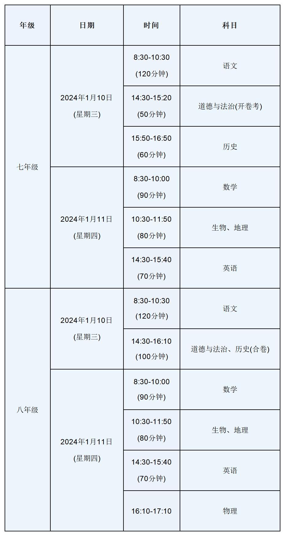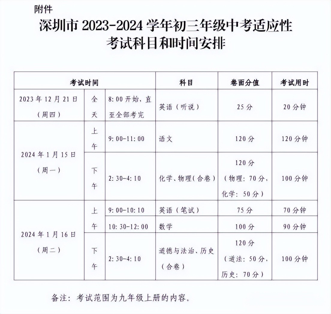 深圳各区初三年级期末考试为全市统考的中考适应性考试,具体时间安排如下: