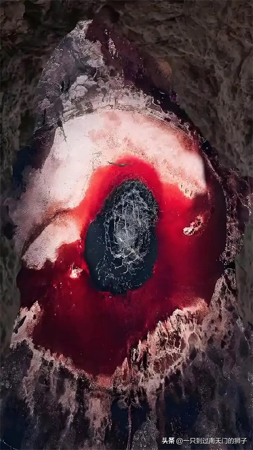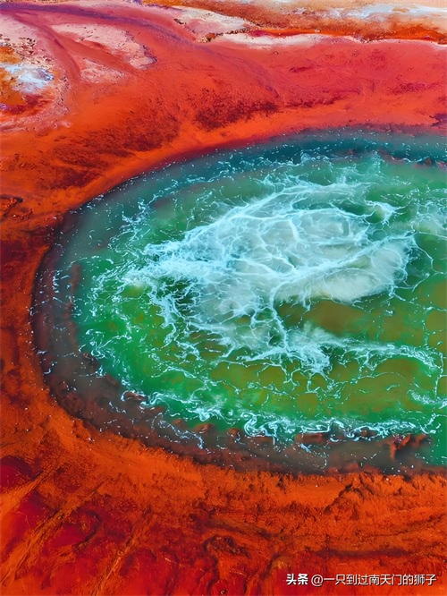 从空中俯瞰,泉眼与喷涌而出的泉水以及周围土地上深红色环带状的沉淀物,组成了一个奇特的瞳孔造型,仿佛一只镶嵌在大地上的眼睛。这里的泉水由于蒸发强烈,流经地表的泉水干涸沉淀后,硫磺和其他矿物质形成了如血管一般的奇特纹路,色彩斑斓,有红褐色、金黄色、铁锈色等,让人惊叹大自然的鬼斧神工,具有油画般的质感。