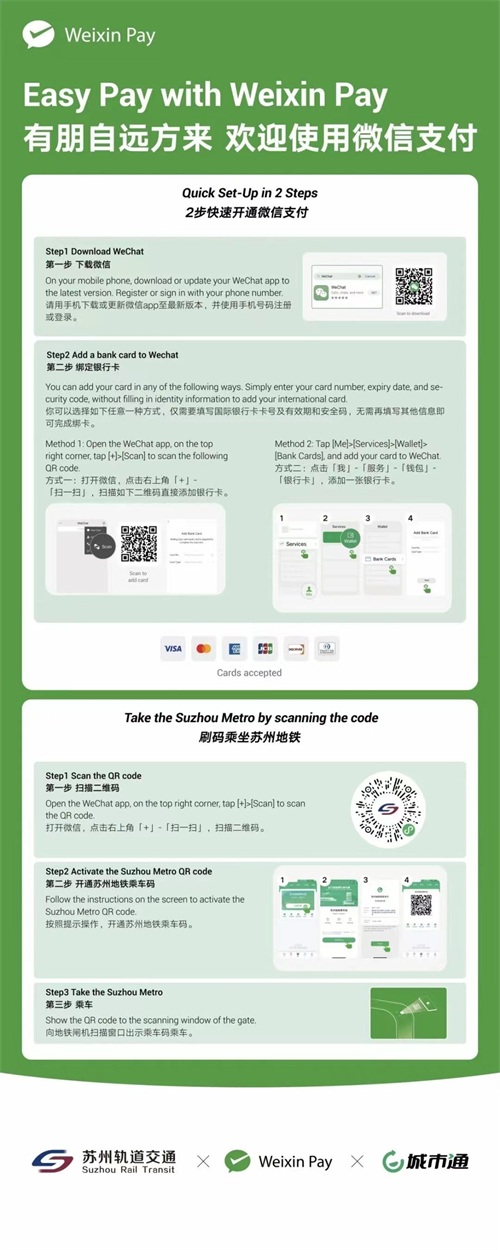 开通小程序刷卡乘车功能后,境外来苏人员只需带一部手机就能搭乘地铁畅游苏州。目前,苏州地铁全线网车站支持6种国外主流银行卡支付,线网各站点客服中心均配备智能POS机,支持维萨(VISA)、万事达(Master Card)、发现卡(Discover Card)、美国运通(AE)、大来(Diners Club)、吉士美(JCB)共6种国外主流银行卡。