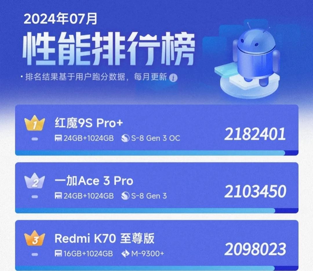 2024年07月安兔兔性能排行榜,K70至尊版排名第三,跑分209万
