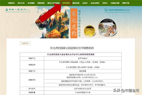 在该页面打开“销售规则”↑。该专区的“东北虎豹国家公园金银纪念币金币云商渠道销售规则”和“东北虎豹国家公园金银纪念币金融机构渠道预约销售信息”将全面展示销售流程、预订方式、抽签机制及重要时间节点等关键信息,确保每位收藏爱好者都能便捷地获取到最新、最准确的购买指导。