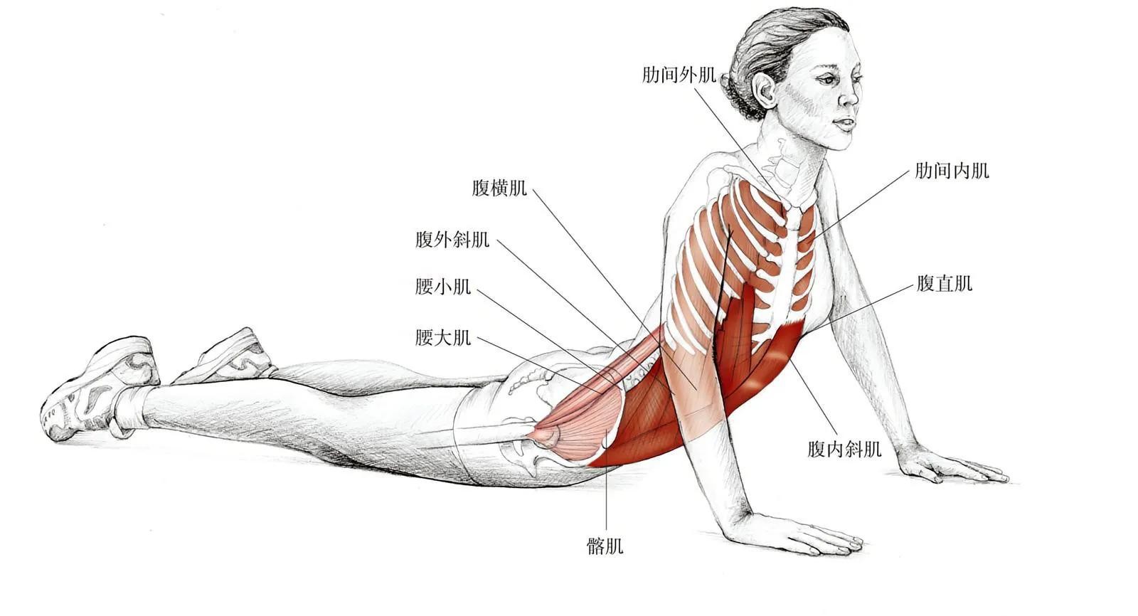 脸朝下趴卧,双手拉近肩膀。髋部平贴在地面,伸直双臂撑起上半身,眼睛看着前方。