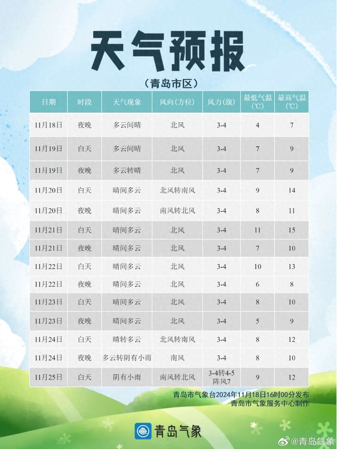 【青岛市区】今天夜间,多云间晴,北风3到4级,明天白天,多云间晴,北风3到4级,相对湿度40%-70%,明天最低气温4℃,最高气温9℃。