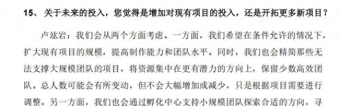 去年9月,卢竑岩曾提出,公司在团队吸收方面持谨慎态度,能不吸收的尽量不吸收,倾向于让团队保持独立,公司仅作为小股东。他认为保持制作人独立自主的创作非常重要,不占太多股份既能给团队留下未来融资的空间,又能激发团队的积极性。