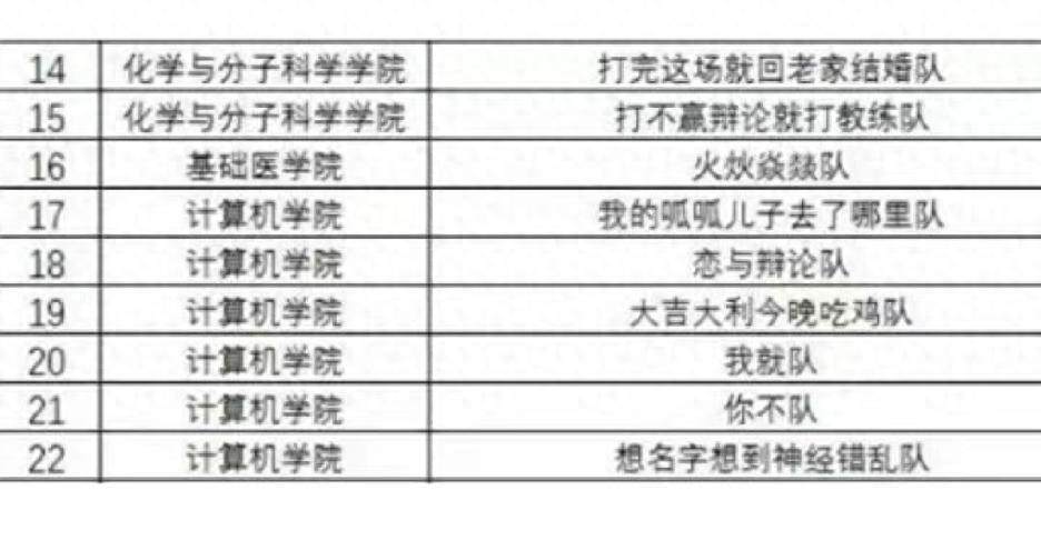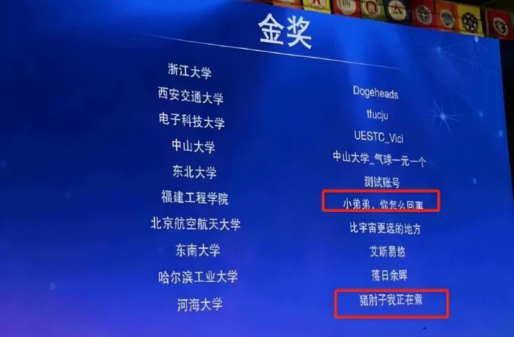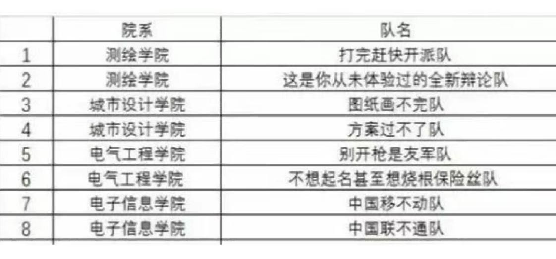 别以为这都是小孩子玩的把戏,这可切实都是大学生们干出来的,名校生也不例外。能参加华为的ICPC国际大学生程序设计竞赛的同学,那可都是名校生且实力不凡啊,却不想在队名上如此随意。
