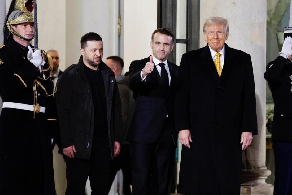 法国总统马克龙(左三)与美国当选总统特朗普(右)和乌克兰总统泽连斯基(左二)会晤后走出爱丽舍宫。