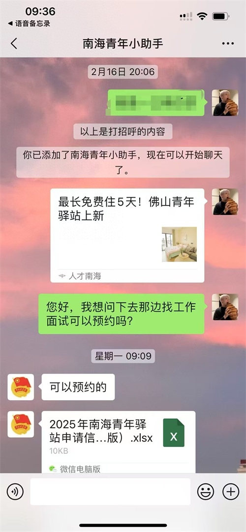 黄海萍回忆到,2月16日,她收到了南海一家食品公司技术助理岗位的面试通知。得益于此前在小红书上看到过关于“青年驿站”的信息,于是立刻行动,在“青春南海”微信公众号添加小助手的微信,获得申请表,很快就收到了申请成功的回复。