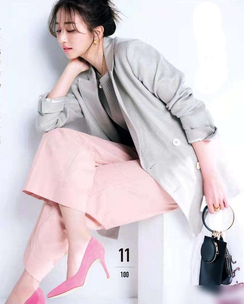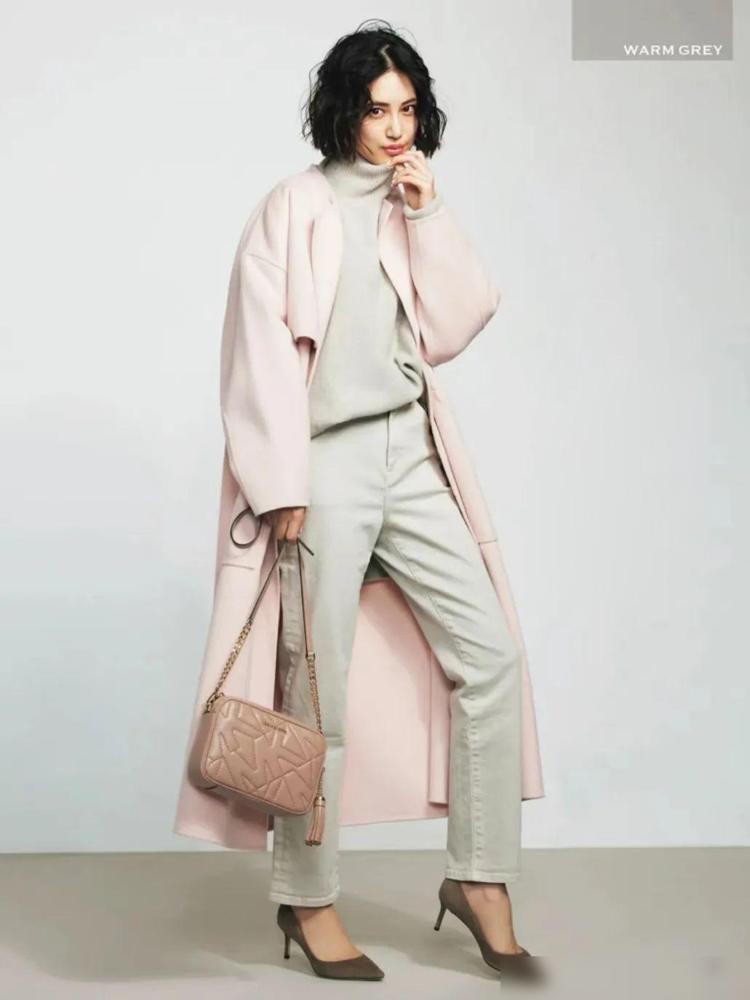 如果选择与桃花粉相比偏暗淡一点的中性色—淡灰来搭配,可以将扑面而来活泼气息成功收敛,使整个穿搭都变得更稳重大方一些,同时也不会让气场看起来太畏缩。