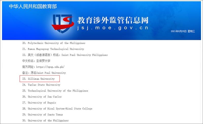 西利曼位列与中国教育部、中留服、中国驻菲使馆、菲律宾高教委的推荐留学高校名录,是受中国教育部留学服务中心认证的菲律宾高等院校。