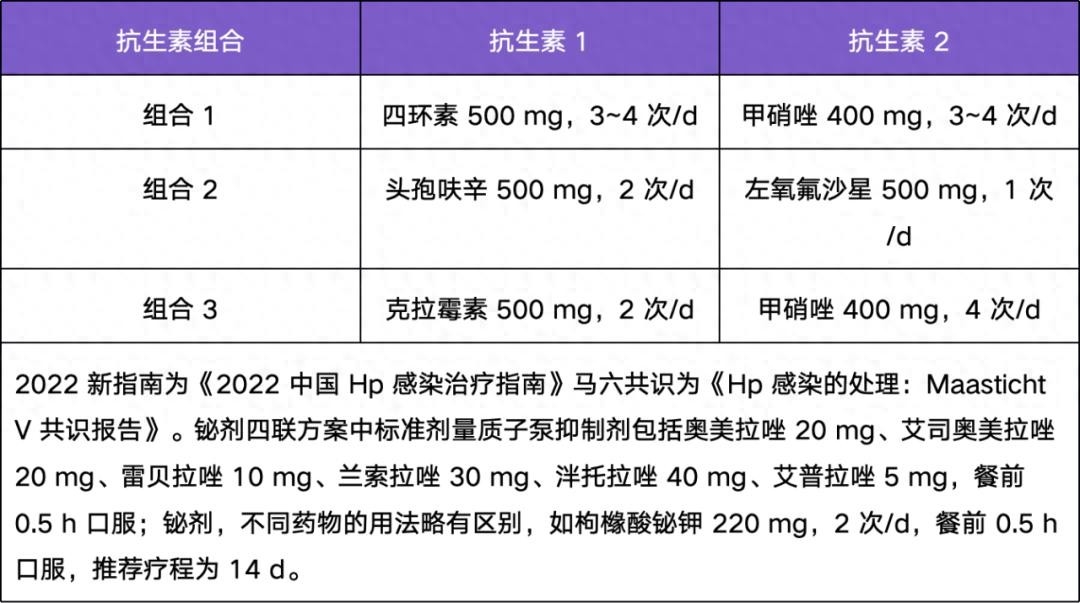 ① 使用铋剂四联方案进行经验性根除治疗,除了 PPI 和铋剂,推荐使用下表中的抗生素组合;