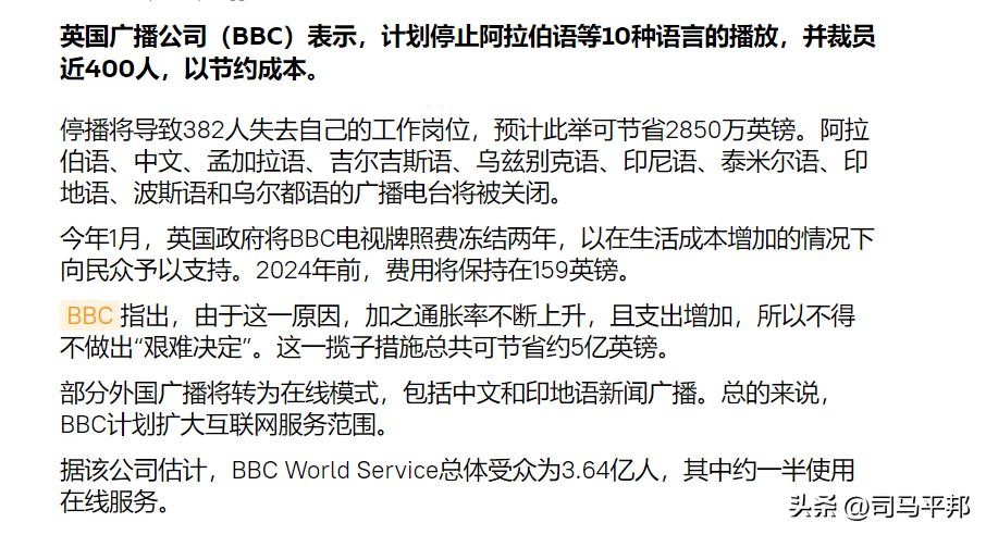 据了解,BBC目前正在酝酿一项大规模精简计划,该计划预计将裁员近400人,停止包括中文、阿拉伯语、孟加拉语、印地语、波斯语和乌尔都语等在内的10种语言的广播服务。