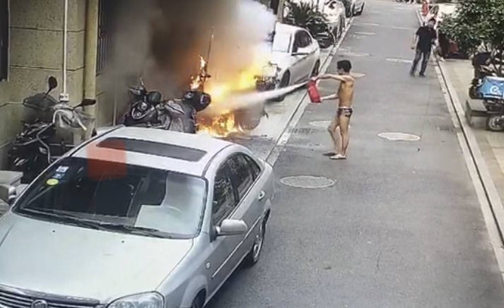 电瓶车熊熊燃烧之际,一名只穿裤衩的小伙子拎着灭火器冲了上去,对着起火电瓶车就是一顿猛喷,很快就遏制了火势。