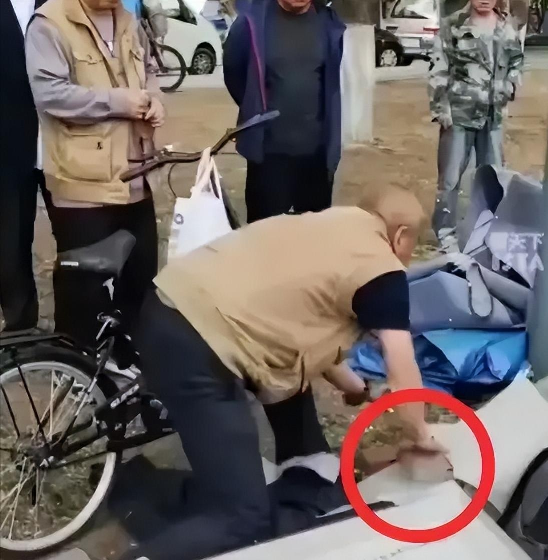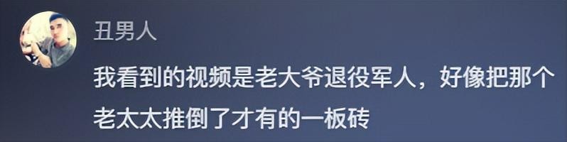 我看到的视频是老大爷退役军人,好像把那个老太太推倒了才有的一板砖。