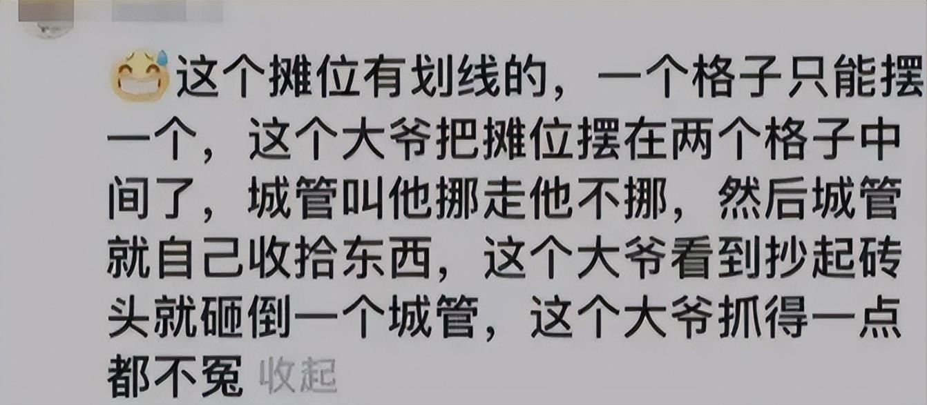 这个摊位有划线的,一个格子只能摆一个,这个大爷把摊位摆在两个格子中间了,城管叫他挪走他不挪,然后城管就自己收拾东西,这个大爷看到抄起砖头就砸倒一个城管,这个大爷抓得一点都不冤。